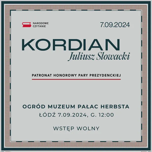 7 września o godzinie 12.00 w Muzeum Pałac Herbsta w Łodzi fragmenty „Kordiana” Juliusza Słowackiego przeczytali nasi aktorzy: Sara Lityńska, Dariusz Bereski, Radosław Osypiuk, Bogusław Suszka i Marcin Włodarski.
